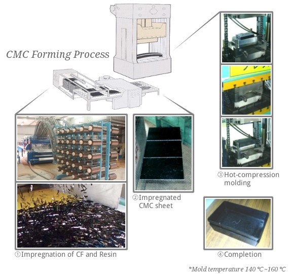 Typical cycle times run 60 minutes up per part via RTM. However, the cycle time of Carbon SMC is only 3-7 minutes depending on the thickness of the sheet.